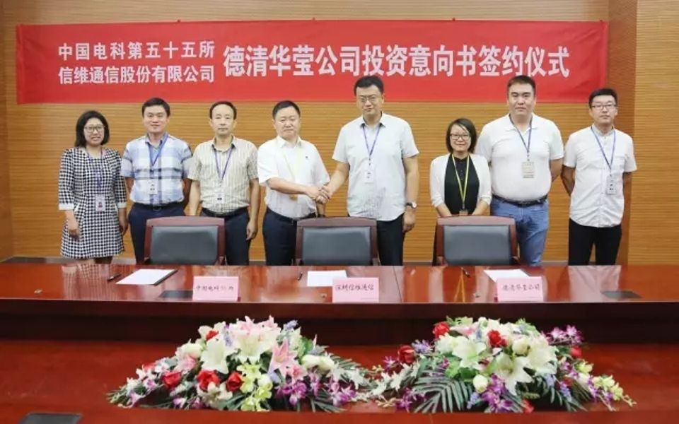 6月16日,深圳信维通信股份有限公司董事长彭浩一行来到五十五所,在前期签订战略合作框架协议的基础上,就增资入股德清华莹公司事宜与所长高涛、副所长铁斌等进行洽谈,并签署了《德清华莹公司投资意向书》。